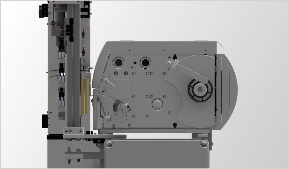 Labeling machine communicates with the test system, triggering label printing and automatic application.