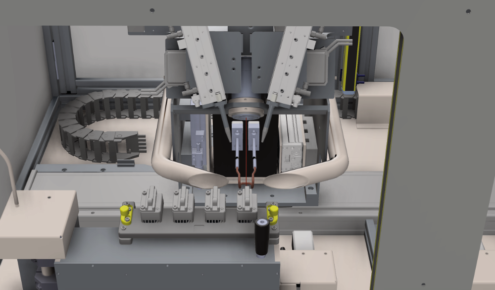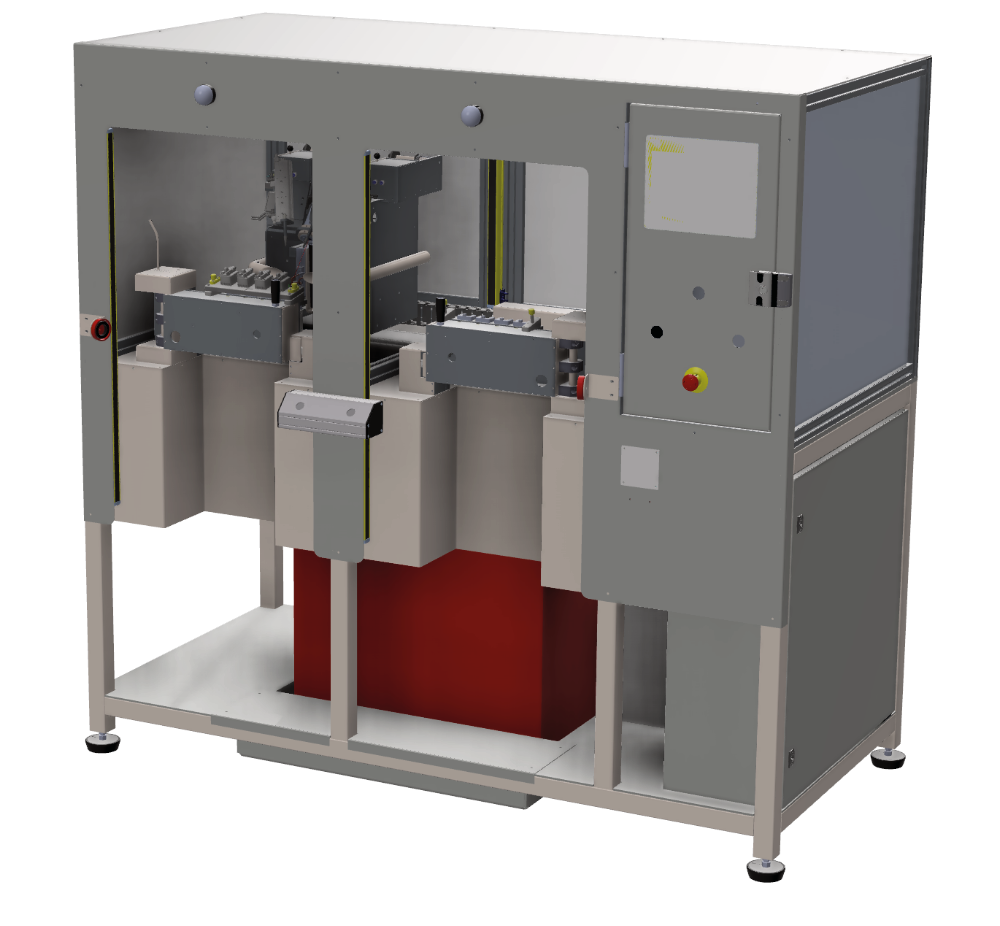 With dual workstations for soldering different types of terminals. It includes flexible fixtures for multiple part numbers, a controlled system for tin quantity, and temperature control via sensors. Additional customizable options include wireless barcode integration and an app for technical data and spare parts.